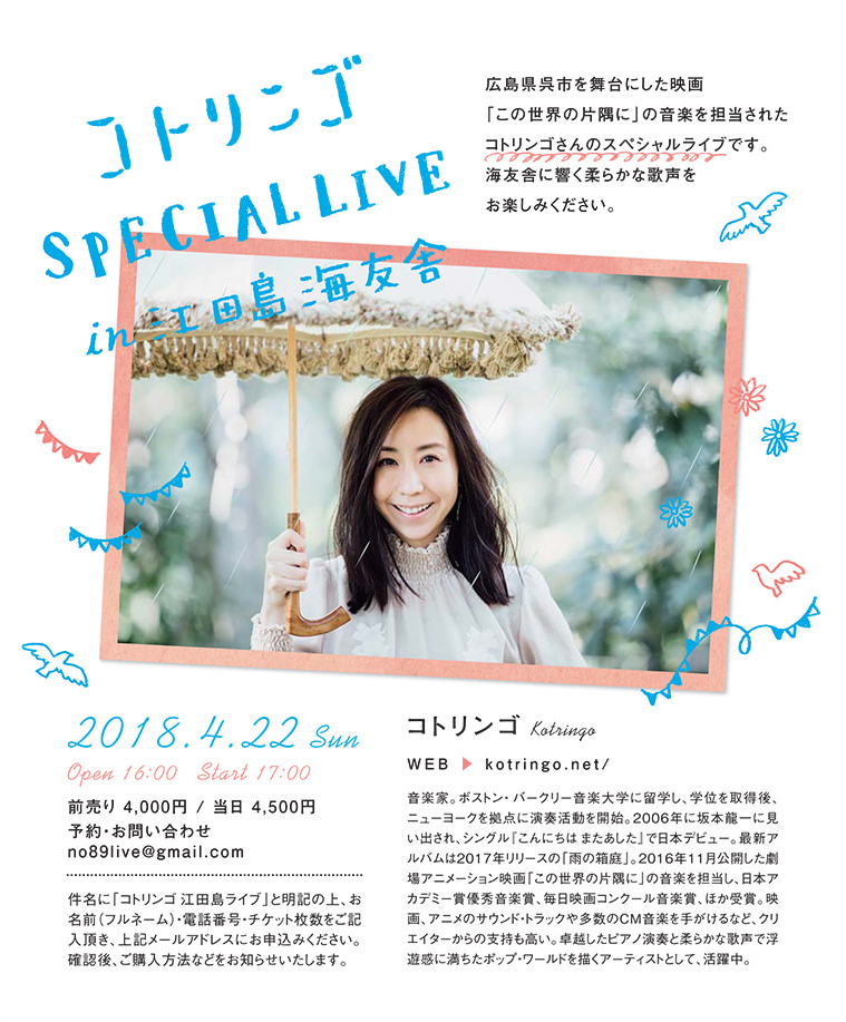 このライブではコトリンゴと縁が深く映画「この世界の片隅に」でも劇中音楽を演奏したチェリスト・徳澤青弦率いるストリングスカルテットとのセッションを展開。