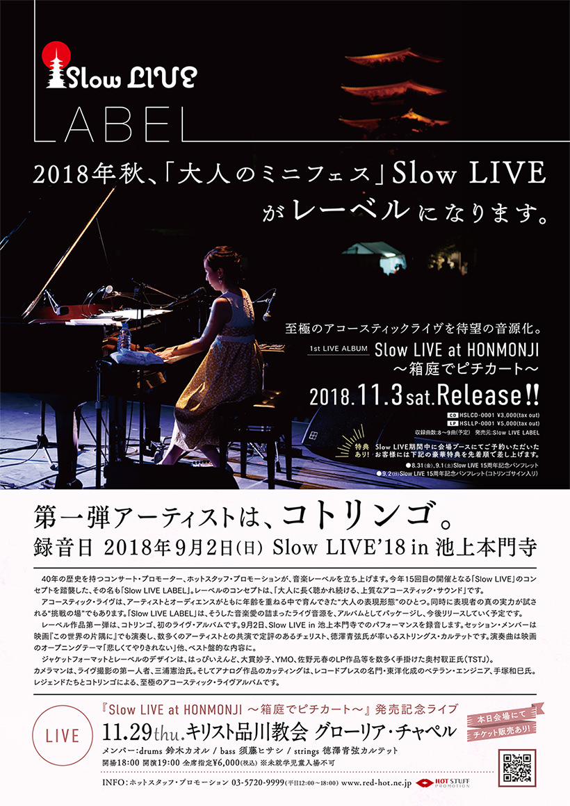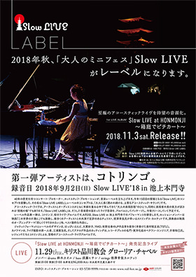 「Slow LIVE LABEL」は今年で15回目の開催となるライブイベント「Slow LIVE」のコンセプトを踏襲したレーベルで、「大人に長く聴かれ続ける、上質なアコースティック・サウンド」をライブアルバムの形で届ける。今回リリースが発表されたコトリンゴのライブアルバムには、9月2日に東京・池上本門寺で行われる「Slow LIVE '18 in 池上本門寺」のライブ音源が収録される。