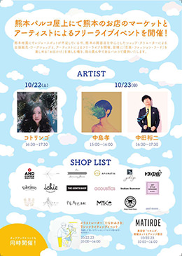 Roof TOP Market in 熊本PARCO 熊本パルコの屋上にて、熊本の路面店を中心としたショップ・クリエーターによる出張販売・ワークショップと、アーティストによるフリーライブを開催。 2016年10月22日(土) 熊本PARCO 16:30〜17:30 コトリンゴ ライブ *マーケットは10月22、23日の2日間の10:00〜18:00開催 詳細はこちら http://kumamoto.parco.jp/page2/event/3528/